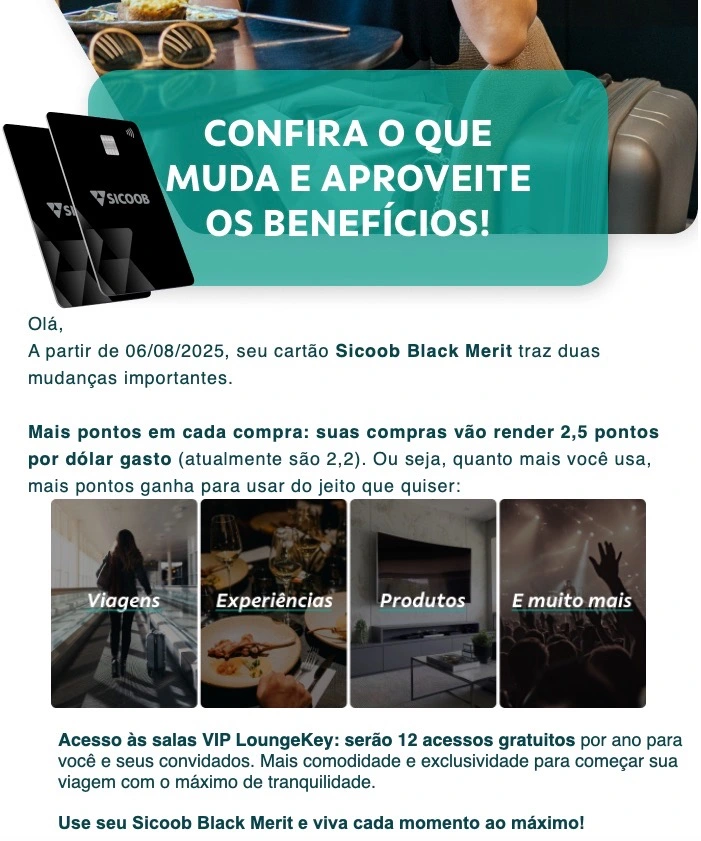 Má notícia para os clientes dos cartões Sicoob Mastercard Black Merit, que a partir do próximo mês, perderão os acessos ilimitados às salas VIP por meio do programa LoungeKey. No entanto, o cartão continuará oferecendo uma das maiores quantidades de acessos do mercado, com 12 usos anuais para seus portadores. Em compensação, a pontuação do cartão será ampliada de 2,2 para 2,5 pontos por dólar gasto.