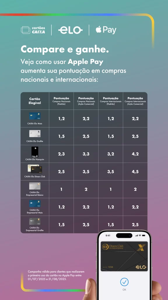 Se você tem um cartão de crédito CAIXA Elo e ainda não usou o Apple Pay, agora é a hora de experimentar. Uma nova promoção da CAIXA está dando pontos extras para quem fizer sua primeira compra com essa carteira digital entre 1º de julho e 31 de agosto de 2025. Uma ótima chance de modernizar seus pagamentos e ainda acumular mais vantagens no programa de pontos da CAIXA. Saiba como participar!